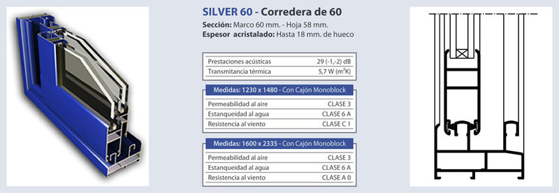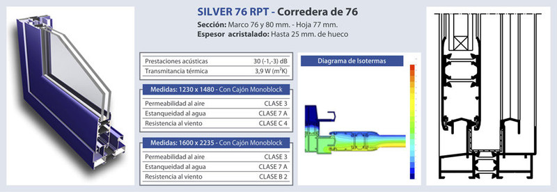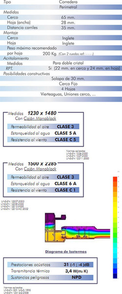 El sistema de construcción y medidas son iguales a su homónima sin rotura, incrementando todas las caracteríticas y ventajas de aislamiento que proporciona la rotura de puente térmico, generada por la unión de los perfiles mediante poliamidas.