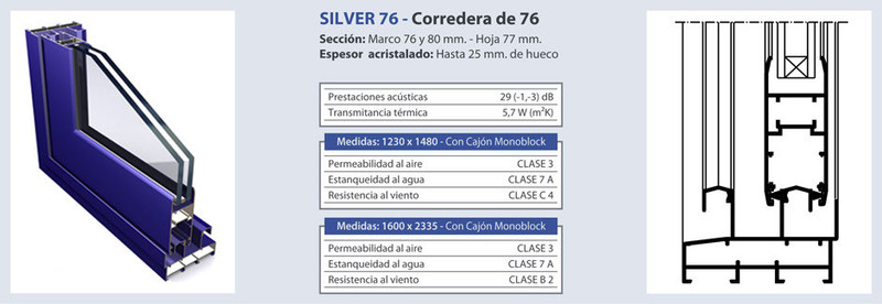 Carpintería con cerco de 76 mm. Mantiene la técnica de construcción perimetral tanto en la hoja como en el cerco. El carril del cerco es de 16 mm. Por lo que se aumenta la superficie de rodadura, evitando los posibles desplazamientos laterales.